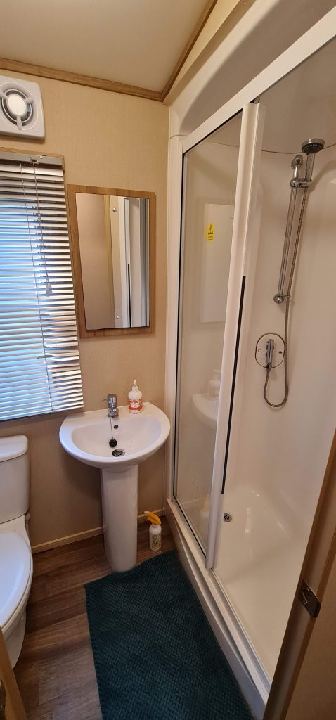 - Family bathroom with large shower, WC, Sink, Mirror, heated towel rail and shelves for toiletries. Loo roll provided.