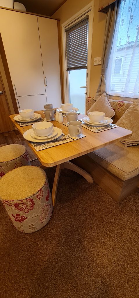 A fully fitted and equipped kitchen for cooking features a 4 burner hob, grille, oven, microwave, toaster, kettle and utensils. If you prefer a day off from cooking, why not try the excellent onsite café New Cod on The Block. Further afield there are restaurants and pubs, the pier, so many amusement arcades and the Skegness Aquarium too. If staying on the site on rainy days there are three televisions (one in each bedroom) and a DVD player, plus family board games. WiFi is now available too. If the kids get bored indoors, there is an onsite arcade The Gold Coast where tokens can be won and swapped for prizes when accompanied by an adult. The onsite Laundry is a short walk away, washer tokens available from Reception*. Don’t forget it’s just a short distance to the sea front and the miles and miles of sandy beach, coastal paths and lots to explore!